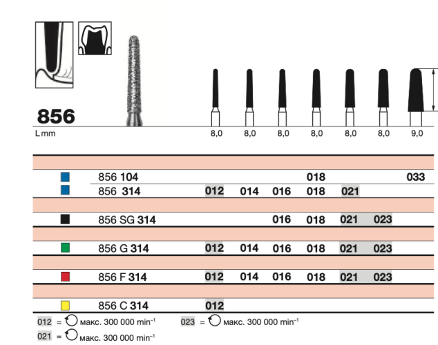 Бор E 856 SC 314.014 – специализированный алмазный инструмент, предназначенный для высокоточной обработки зубных тканей. Он используется в стоматологии для препарирования кариозных полостей, а также подготовки зубов под коронки и реставрации.